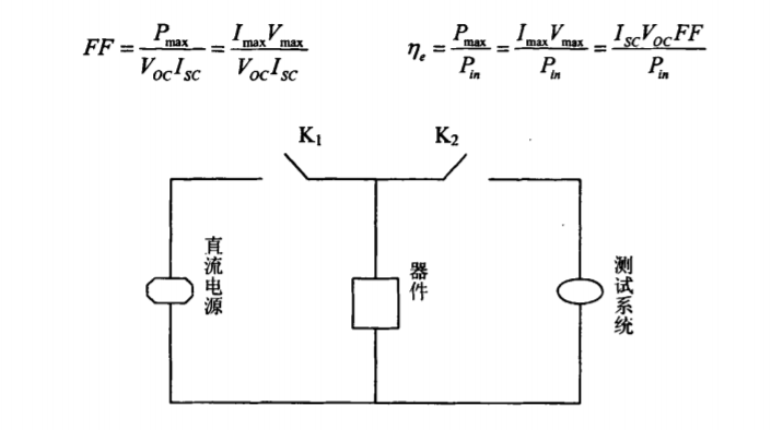 下图是LEC光伏响应测试过程的结构简图。测试中的LEC器件被放置于手套箱(H20<lppm,02<lppm),尽量避免H20及02的影响。将LEC器件如下图进行连接,同时将直流电源和外界测试系统按照简图与LEC连接起来。测试时,首先将开关Kl闭合,为LEC加4 V的预置电压2 rain(根据第二章的分析),然后断开Kj,闭合K2,使LEC进入测试系统。用10mW/cm2的LED作为测试光源,用Keithley2400对LEC进行光电流及暗电流相对于电压的光伏特性扫描,其中扫描电压为.1~1.5 V。所有测试均是在室温下完成。对测试数据中的电流取对数,电压保持不变,获得成LEC光伏响应的特性曲线。而光电流.电压图中的开路电压(Voc)是当光电流最小时的偏压,短路电流(Isc)贝tJ是零偏压时的光电流。同时,根据下面的两个公式还可以得到室温LEC作为光伏器件的效率。