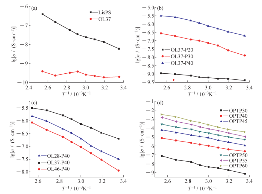 图( c )所示为OPB1-LisPs mPEG 共混全固态聚合物电解质膜的电导率-温度关系图。可以看出,并不是 LisPS 质量分数最高的OL28P40电导率最高、相对的, LisPs 质量分数中等的OL37-P40电导率最高,这与锂盐的解离程度有关。当 LisPs 质量分数过低时,锂离子浓度太低,而 LisPS 质量分数高时,其中的磺酸锂未能完全解离,因此电导率也会变低(相比于OL37-P40)