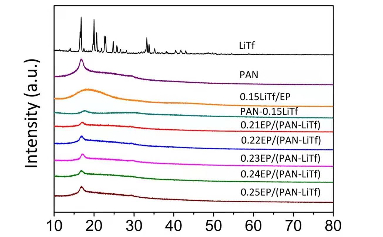 为了进一步证明 PAN、EP 和 LiOTf 具有良好相容性和分散性,测试了 LiOTf、PAN树脂及各复合材料的 XRD 曲线: