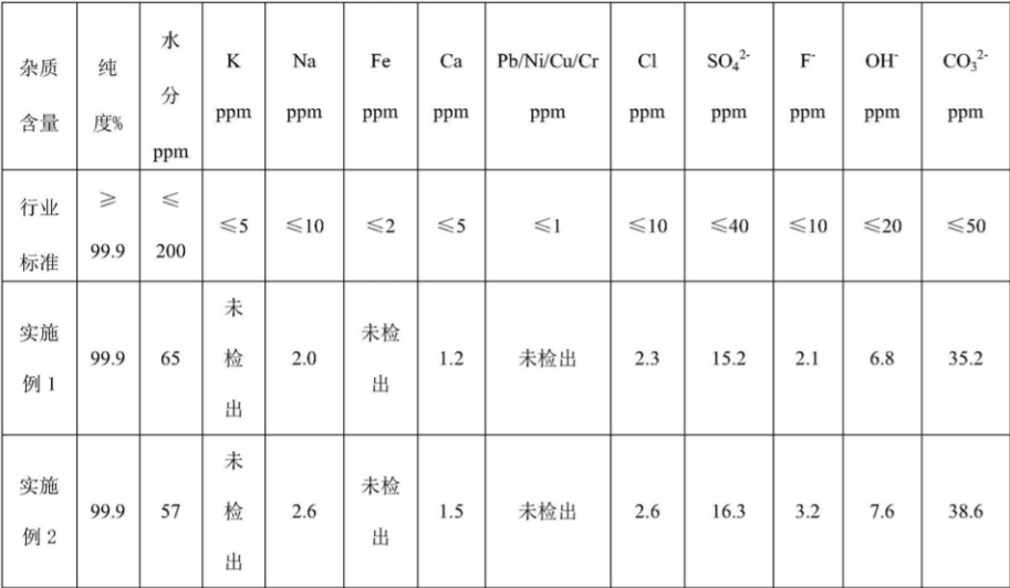 上述实施例制得的目标产物 三氟甲基磺酸锂的纯度及杂质含量列表如下: