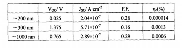 下图一是不同膜厚LEC室温下的光伏特性曲线。这些不同厚度的膜是通过选择相同体积(45uL)的LEC溶液,不同旋转速度1500 rps、2000 rps及3500 rps而得到的。转速越大,复合膜越薄。器件结构:ITO/MEH.PPV:PEO: LiCF3S03脚。工作面积为6 mm2,测试光源为10mW/cm2LED灯,光伏响应通过Keithley2400测得。测试方法是先用直流电源为LEC加4 V预置电压2 min,然后撤掉该电压,用10mW/cm2LED照射工作点,同时用Keitllley2400对器件进行扫描,电压范围是.1~1.5 V。结合图一和表图二可以看出,当膜厚~200nm时,器件的Voc=O.025 V,转换效率在10的负五数量级,比其它两个厚度小两个数量级,光伏响应非常小。当厚度~300 nm时,Voc=1.375 V,Jsc=5.7l×10~A/cm2,似%)=O。0013。当膜厚~1000am时,器件的Voc、Jsc及T(%)比膜厚~300mn时都小了一倍。