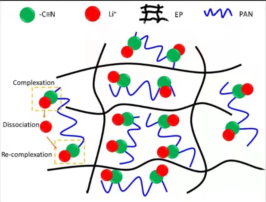 PAN-0.15LiOTf 复合材料的电导率-频率曲线呈现典型的导体特征,这是因为氰基与锂离子存在络合现象[85, 90, 105],在不断的络合、解离、再络合的过程中,锂离子实现了定向移动图二,从而具有高导电性。与 EP 树脂一样,0.15LiOTf/EP 也呈现典型的绝缘体特征,这是由于 LiOTf无法溶解在 EP 中,EP 不具有可溶剂化的极性基团,因此无法与 LiOTf 形成缔合物,与其相结构一致,0.15LiOTf/EP 中无法实现 Li+的定向移动,因此 0.15LiOTf/EP呈现典型的绝缘体特征。