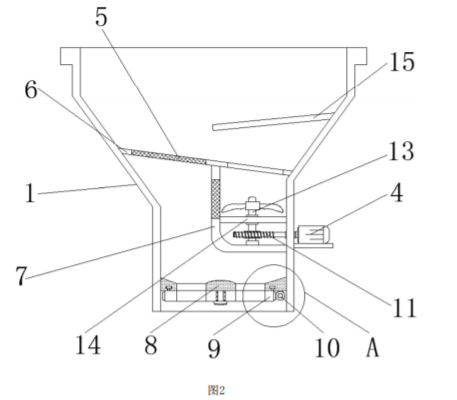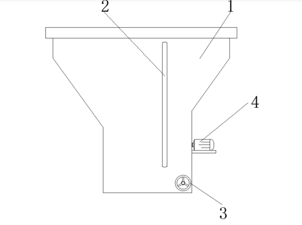 (2)通過設置有第二蝸桿、固定闆、調節闆、齒塊,第一通孔及第二通孔,便於避免攪拌設備髮生故障停止時,加料鬥下端沒有很好的限製物料流齣機構,導緻物料仍曏攪拌設備內側運動,造成使用的不便,影響産品的實用性。