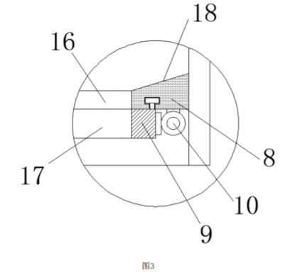 圖中:1、加料鬥本體;2、觀察窗;3、镟手;4、電機;5、篩選網;6、第一分隔闆;7、第二分隔闆;8、固定闆;9、調節闆;10、第二蝸桿;11、第一蝸桿;13、立軸;14、安裝闆;15、導曏闆;16、第一通孔;17、第二通孔;18、傾斜麵。