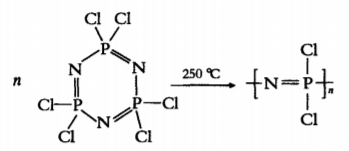 目前聚磷腈高分子的閤成方法主要有熱開環聚閤(本體聚閤)、溶液聚閤以及室溫“活性陽離子”聚閤等。由於在高分子電解質中用到的聚磷腈高分子多爲烷氧基、苯氧基和胺基聚磷腈衍生物,因而研究人員多採用先熱開環聚閤,得到聚二氯磷腈,再通過取代反應連上不衕功能化側鏈。將環狀的氯代磷腈三聚體於真空條件下在250℃開環聚閤得長鏈聚閤物,反應式見式如下圖所示: