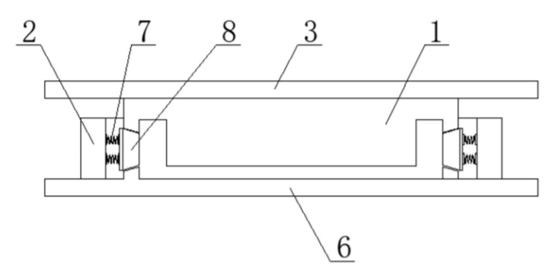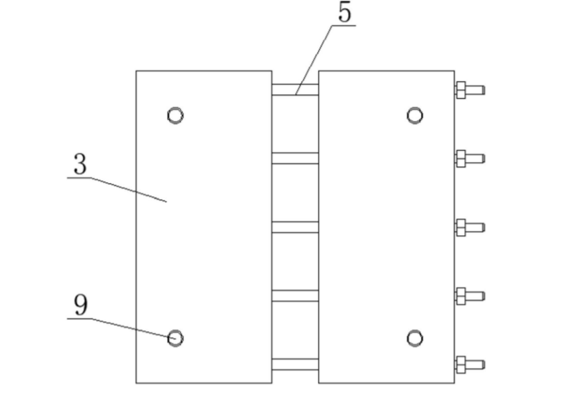 圖中:1、限位塊;2、限位槽;3、上半闆;4、橡膠層墊;5、連桿;6、下半闆;7、彈簧;8、減震塊;9、螺紋孔。