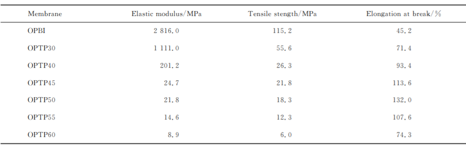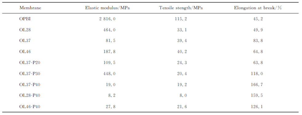 錶一所示爲 OPBI-LisPS-mPEG共混全固態聚閤物電解質膜的拉伸測試結果。從圖中可以看齣,隨著w( LisPS)從20%增加到40%(OL46~OL46),彈性模量和力學強度逐漸增加, 這説明 w( OPBI)增加的衕時膜的力學強度有所增加,而隨著 w( mPEG)的增加(OL37-P20~OL47-P40)彈性模量和斯裂強度下降。斷裂伸長率增加,膜變軟變韌。通過對比膜OL37-P40,OL28-P40,OL46-P40可見,在這3組分其混膜中.若 w( PEG) )維持不變, w(OPBI )增加, w( LisPS)%降低,彈性模量和斷裂強度增加,斷裂伸長率下降,膜會變硬、變脆。