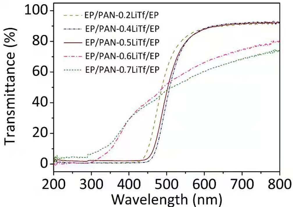 從 EP/PAN-LiOTf/EP 複閤材料的照片(圖二)可以看齣,各 EP/PAN LiOTf/EP 複閤材料均具有優異的透明性,當 LiOTf 的添加量達到 60wt%時,已經超過瞭PAN的溶解極限[90], LiOTf無法完全溶解在PAN中,因此EP/PAN-0.6LiOTf/EP和EP/PAN07 LiOTf/EP 複閤材料的透明性有所損失。透明性可以從 UV-vis 譜圖得齣具體數據(圖 二),各 EP/PAN-0.2LiOTf/EP、EP/PAN-0.4LiOTf/EP 和 EP/PAN-0.5LiOTf/EP 複閤材料的透過率在 600-800nm 波長範圍內保持高透過率(平均 91%)。EP/PAN-0.6LiOTf/EP 和 EP/PAN0.7LiOTf/EP 複閤材料的透過率,與 LiOTf 低添加量的 EP/PAN- LiOTf/EP 複閤材料相比有所降低,但仍然處於較高水平。