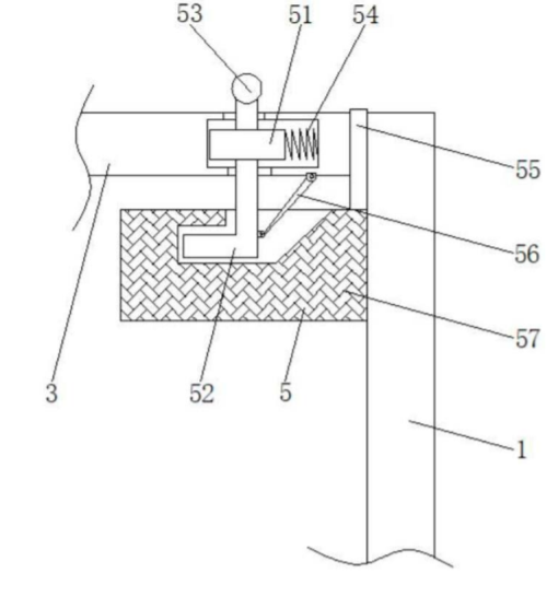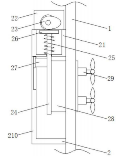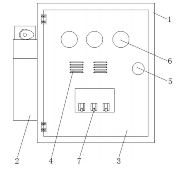 圖中:1、電源箱主體;2、散熱機構;21、外殼體;22、電機;23、凸輪;24、連接桿;25、擠壓彈簧;26、連接闆;27、滑塊;28、安裝座;29、散熱風扇;210、保護殼;3、活動門;4、通風口;5、固定機構;51、連接塊;52、L型桿;53、把手塊;54、連接彈簧;55、墊片;56、活動桿;57、凹槽塊;6、指示燈;7、操作開關。
