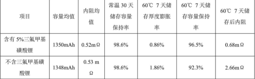 由上述錶可知,本髮明設計得到的 三氟甲基磺痠鋰有利於改善電池的高溫儲存性能。